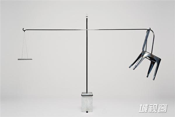 ↑studio formafantasma重新设计的作品。“我们的设计理念是让公众了解更多关于‘chaise a’座椅的内容。于是我们既没有对原有设计做任何改变,也没有向其中加入其它元素。而是将原版座椅悬挂在天平的一个悬臂上,天平另一端挂着与座椅重量相等的一块金属块。我们希望通过这样的展示方式让公众有机会探索‘chaise a’座椅的生产过程,同时领略到该款座椅的设计的精妙之处。”