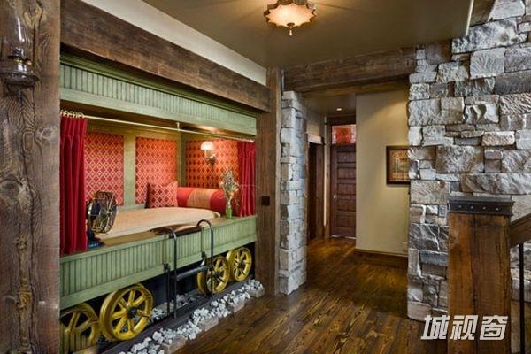 墙面被打造成立体的白色砖墙,旧旧的木质元素当然也不能少,这是一间具有怀旧气息的儿童房,儿童床甚至被打造成火车车厢,床头的小灯散发出暖色调灯光,窗边还有有一个与床铺相连的小梯子,把车厢效果做到了极致。这间儿童房虽然气氛怀旧,但依然能够吸引到孩子的目光吧,因为它够好玩!
