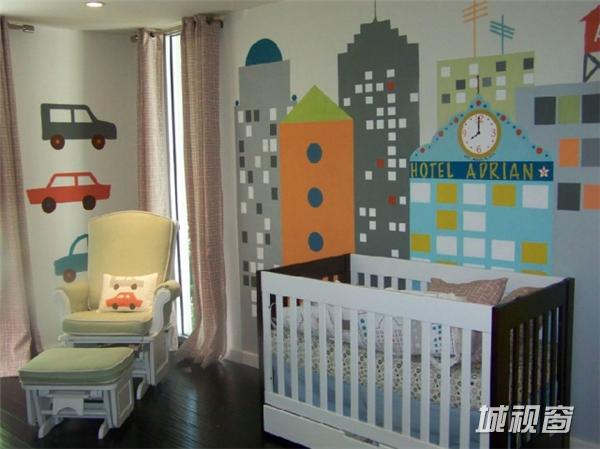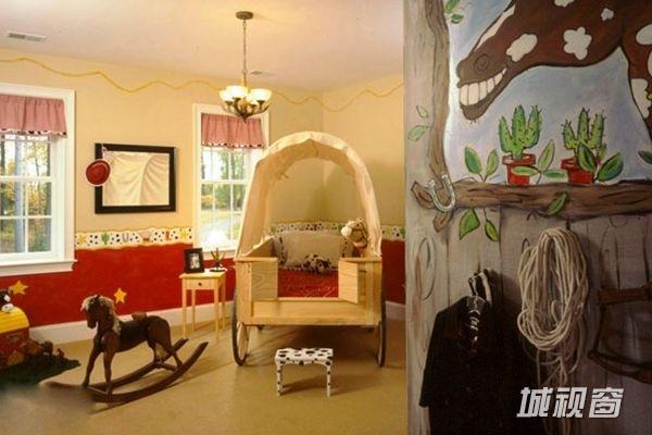 看过了各种集聚跑车、火车元素的儿童房后,这间儿童房一定又会给你带来不一样的感觉。这间以马车作为主题的儿童房,把儿童床打造成马车的造型,让人有种上了马车就会策马到别处的感觉,对于孩子来说一定够新奇。墙面上卡通马造型涂鸦也与整间儿童房主题相一致,很是有趣。