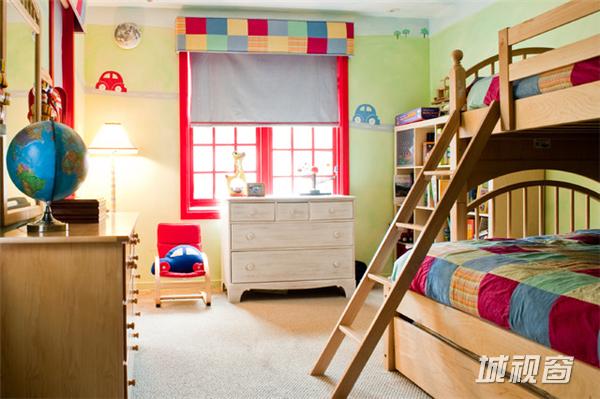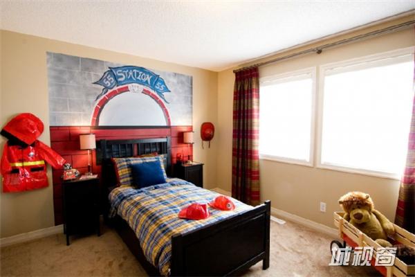 以红色跑车造型的儿童床与油桶造型的床头柜作为这间儿童房的最大亮点,而背景墙更是以拥有伦敦眼的米字旗来体现出整间儿童房的摩登感,让儿童房不缺乏童趣的同时还能拥有一种时尚气息,小编只能说这间儿童房酷毙了!