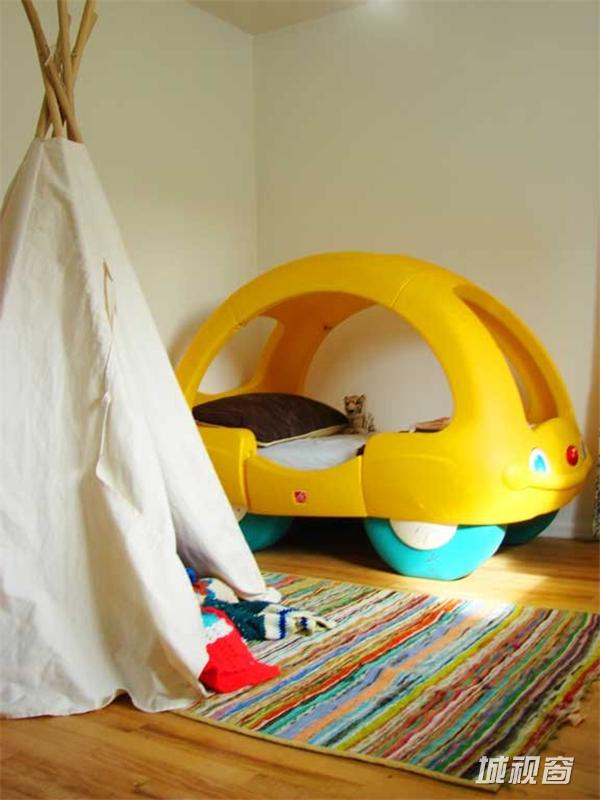 汽车造型的儿童床总是会在一定程度上让人在视觉上感觉很新奇,且具有安全感。原木色地板让整个房间显得简单纯真,而新奇的儿童床正好体现出了整个儿童房的张扬个性。