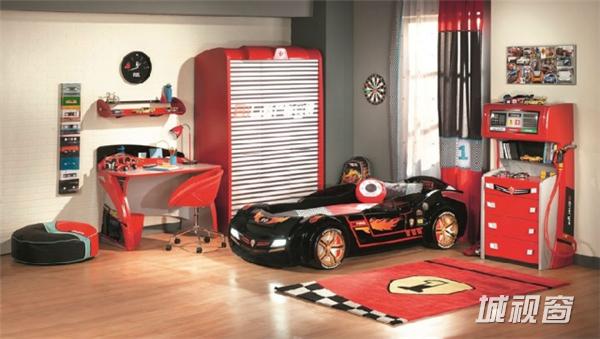在原木色地板上以酷黑色赛车外观的儿童床与具有主题性的衣物收纳柜摆放在一起,这样酷酷的儿童房空间一定会吸引不少男孩的注意力。