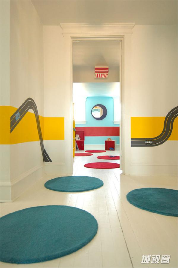 把整个房间打造成一个小小赛车场的样子,地台的设计还能让房间内多处一个下坡弯道,更是体现出了这间儿童房的主体性,而家具也都打造成与赛车相关联的外观,使整个儿童房中充满了童趣。