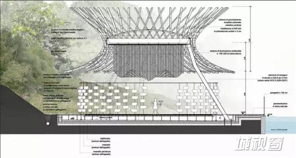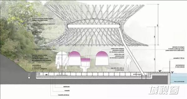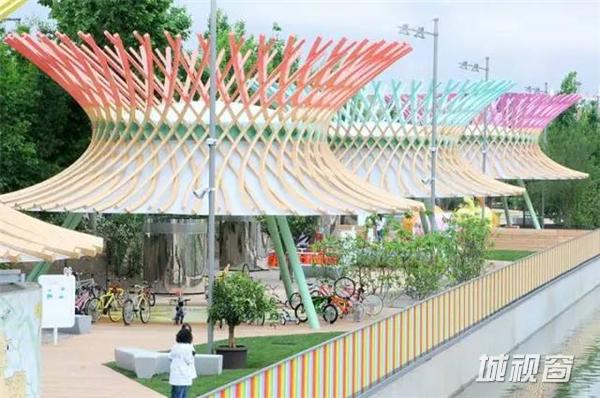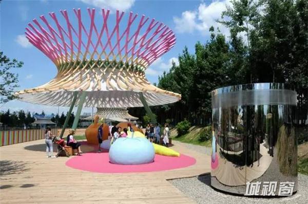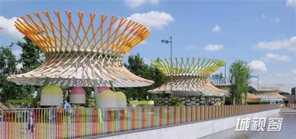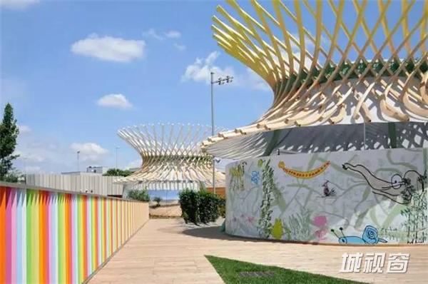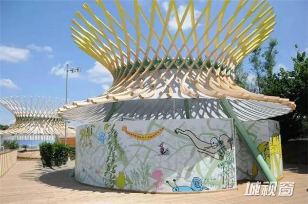 儿童乐园设施结构,包括儿童浴室、监控展品的技术设备、安全监测、技术领域和通往广场的楼梯在三个不同的宽度铺着落叶松木,每个染成不同的米色和随机双曲线,使结构消失和增加物质和颜色的视觉感知。公园的入口和出口设有野餐区,周围种满各种植被,并配备了彩虹色的凉亭的空地,迷宫般的反射棱镜,其他的更多惊喜挂在树上。