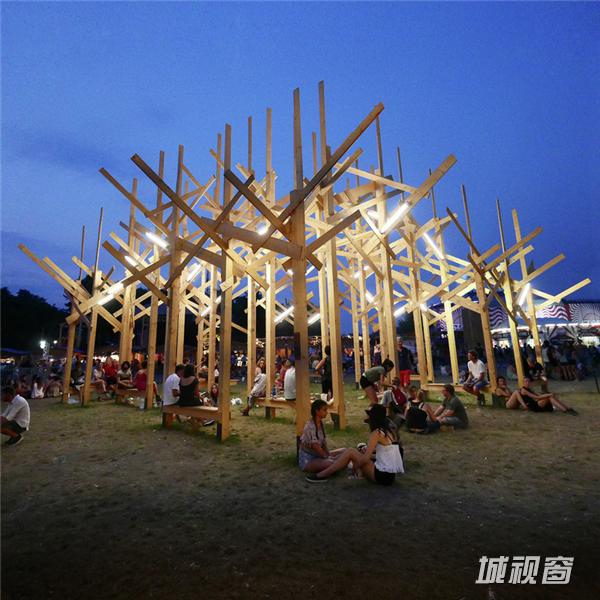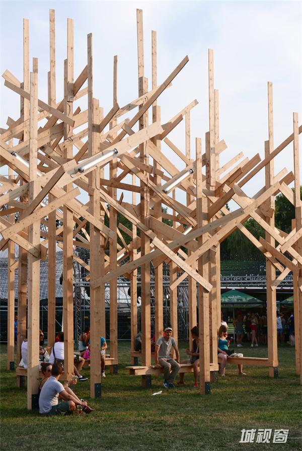Atelier YokYok工作室最近连同Sammode一起,为2015匈牙利布达佩斯音乐节设计了一座名为“Treedom”的临时“几何形森林”。该项目在音乐节开幕前九天组装完成,在活动结束后两天完成了拆卸工作。这座装置由37根木杆、超过200块木板组成,高度超过10米。