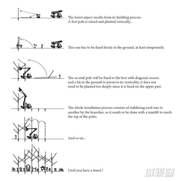 无数的“树杆”被无序的排列在一块方格区域中,带给人们一种多样化的密度体验,而参观者所在的位置不同,也能形成移步换景的效果。为了让这种植被的效果2逼真,设计师在拼接工艺上也是下了不少功夫。