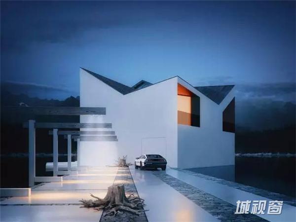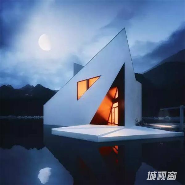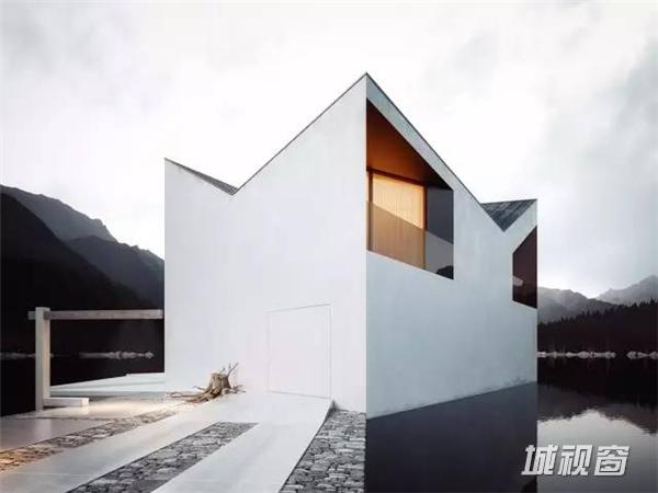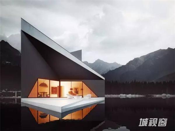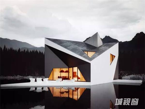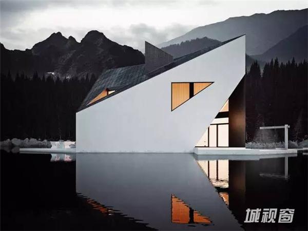 这栋棱角尖锐的建筑,将被建在充满诗情画意的群山之中,在这大自然的环抱中,该房屋更加的突出,房屋的尖屋顶高矮错落,与后面的大山有一种层叠的韵律感。侧面的三角形窗户,像眼睛一样有动感,黑白灰的色调让房屋更加时尚与独特。全开放的落地窗也被设计成几何形状,与整体的建筑更加协调。