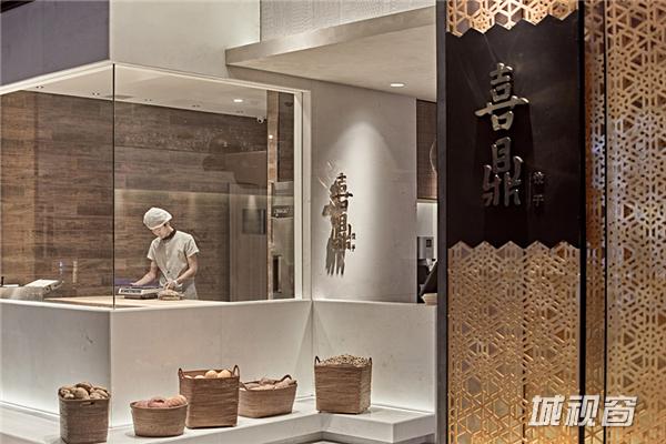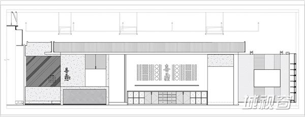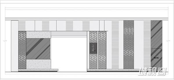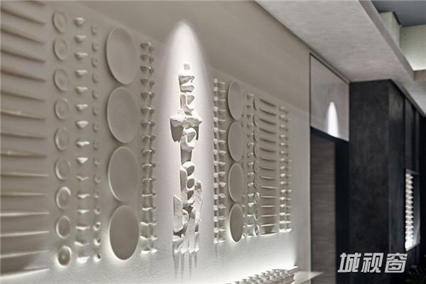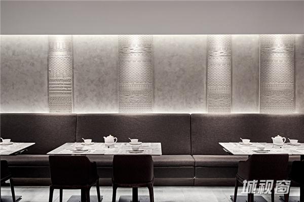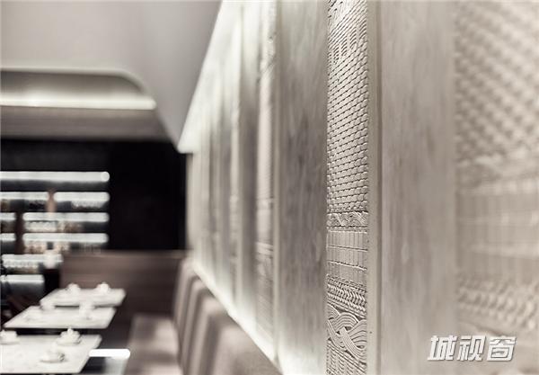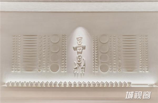 该店铺整体门头较宽广,为设计师提供了较为理想的设计环境。在门头设计上,睿集设计采用大面积水泥质感的灰色浮雕面墙面处理,墙面的浮雕花纹根据藤编图案1:1开模制作成,浮雕藤编图案还有一种化石感,从而加深了时间印记,饺子是一个古老传统的食物,这个点使它和化石感的浮雕面有种隐喻的呼应。设计师结合金属雕刻的渐变几何图案格栅,与入口处白色大理石台面相呼应,充分的展示整体门头效果;入口处开敞式明档设计,体现其新鲜、手作、朴素的品牌精髓。