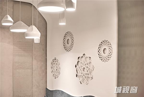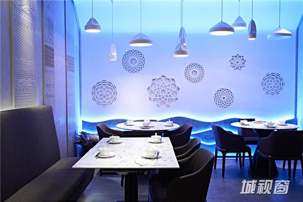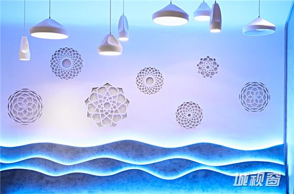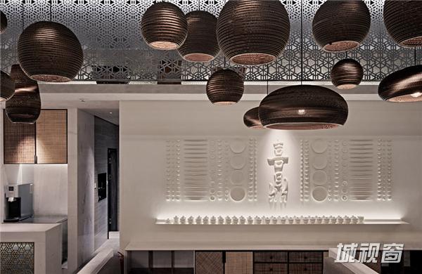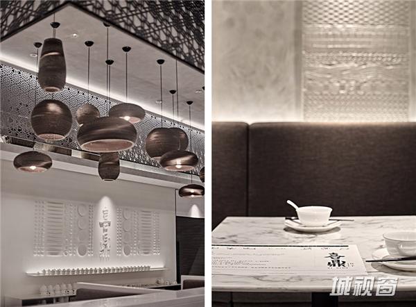 内部空间风格则作为门头整体简洁、大气风格的延续,为通透整体的一个空间。中央为卡座区域,设计师使用大面积的天花格栅镂空造型,在空间上进行视觉化分区。配合错落有致的吊灯与圆弧型墙面,增添空间的趣味性与可读性。入口处形象墙上的喜鼎LOGO与饺子立体拼图,均为设计师的匠心独具,加上藤编材质台面贴面与手作藤编框的加入,更增添简朴风味。餐厅的风格布局以舒适为导向,以小型聚会为诉求的消费者,环境清幽,餐厅灯具设计也以点光重点照明为主,整体雅致、简约。为消费者打造了错落,更具层次感的体验功空间。更有风格鲜明的海洋元素设计区域,为该店铺主打产品提供点睛之笔。