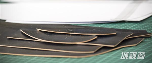 4、裁版,上一步多裁剪的两到三厘米的皮料因为染色过程中难免会将边缘弄脏掉,所以这一个裁切掉就能得到一个干净的边缘,如果比较厚的皮料需要进行皮料的削边,并进行边缘打磨,可以用床面处理剂,也可以用CMC,床面如果不平整的话也需要用处理剂进行整理;