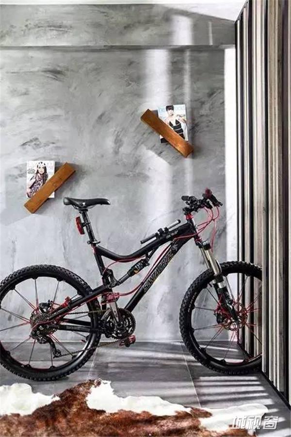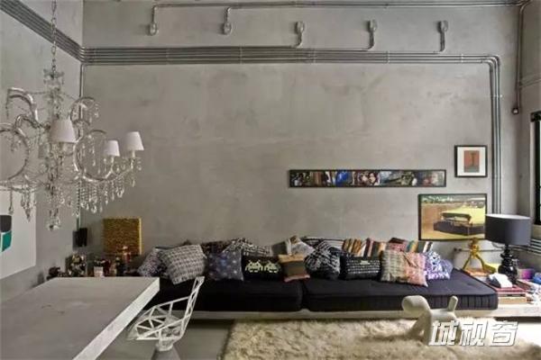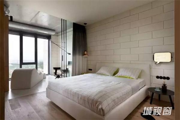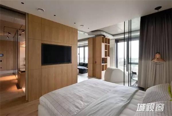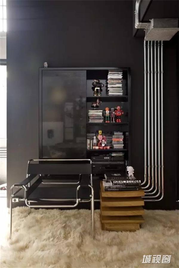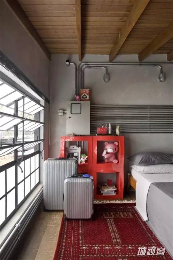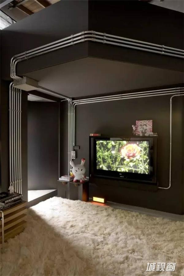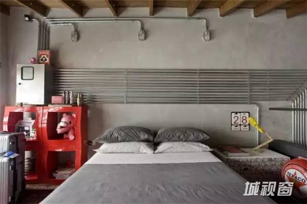 因为原有的多媒体装置在这个房间,所以整排的金属管就成了卧室的背景墙。