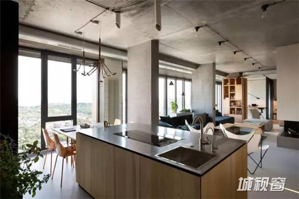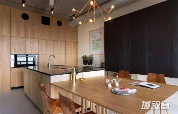 厨房中岛上方的射灯用PVC套管来装饰,像是从楼上插下来的管子,也让其他保留的管道感觉不那么突兀。