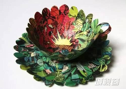 为了创造出各式各样的作品,Cecilia Levy会将书本、杂志、漫画的内页撕成一小块一小块的,最后再将它们全部黏起来变成某种物件。