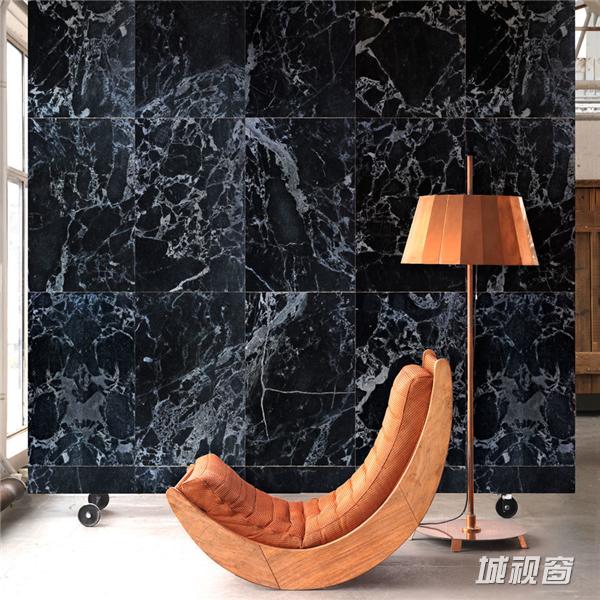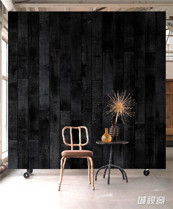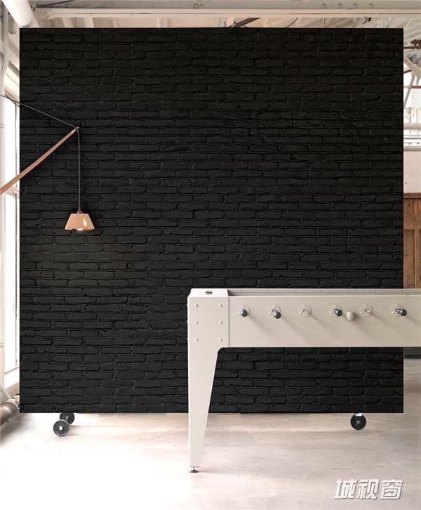 黑色的砖墙本不常见,在这里涂上黑色是希望能够掩盖旧砖墙外观上的瑕疵。Piet Hein Eek在荷兰的工厂里有许多砖墙,但他认为它们并不好看,不像纽约城市中常见的那种砖;而涂黑之后,这样的砖墙在任何地方都会很适合,看起来也美观了。这位荷兰设计师还设计过其他有意思的墙纸,点击这里可以看他过去的墙纸作品。