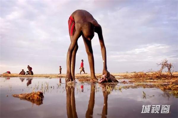 Photo and caption by Christena Dowsett。图为一个小型部落的居民正在河边杀鱼。这个部落是世界上第二小的部落,大概有6万到8万人,居住在埃塞俄比亚和肯尼亚的边境。他们是传统的游牧民族,经常在两国之间游荡。过去20年间,由于连续的干旱缺水,该部落30%的人以打渔和吃鱼为生。