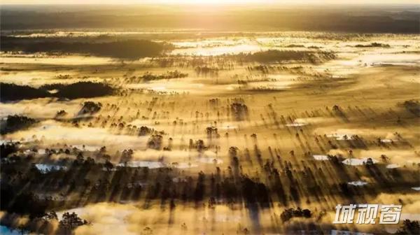 Photo and caption by Kaiti Lillipuu。 “在日落之后,我们看见雾气正在渐渐形成,于是我们设定了凌晨3点的闹钟,想再睹日出时候雾气的风采,到达拍摄地点,我们看见沼泽被雾气笼罩,于是开启无人机拍摄,飞过树林,拍到令人震惊的画面,光线、雾、影子、沼泽融为一体。这画面太美了。”
