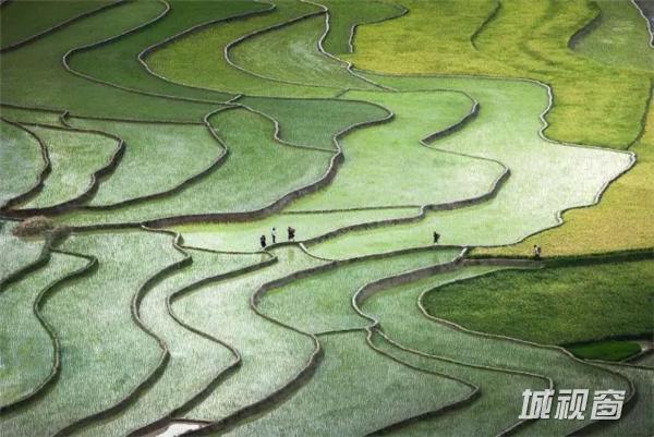 Photo and caption by Quỳnh Anh Nguyen。 越南北部安沛省,涂乐谷,几名刚刚忙完播种的农民穿行在错落有致的梯田上。