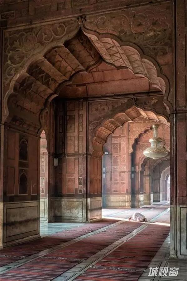 Photo and caption by Dale Johnson。 清晨新德里贾马清真寺,一个男人开始祈祷。