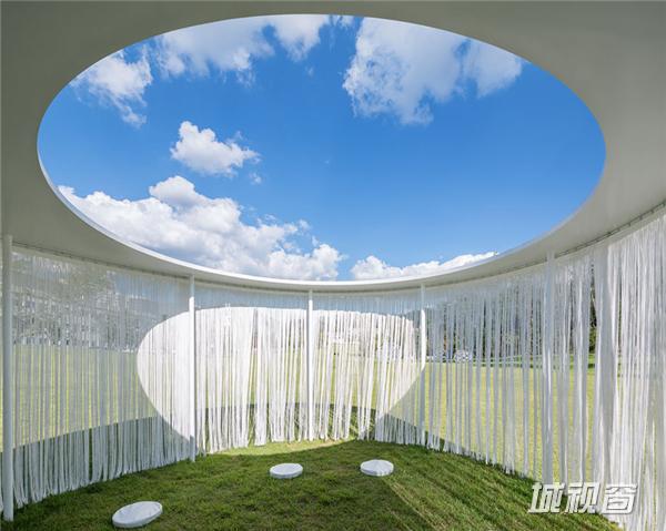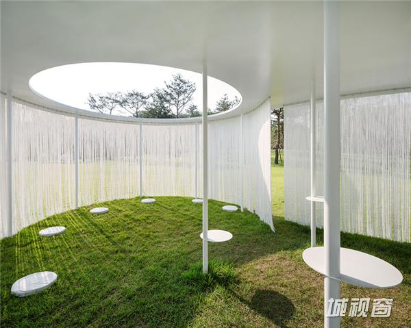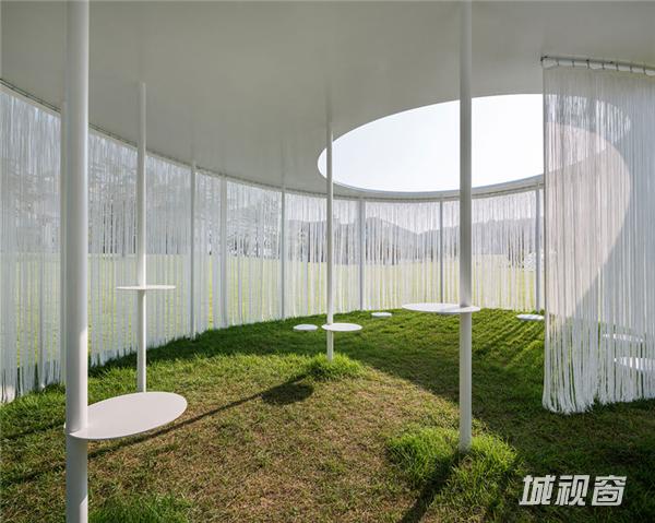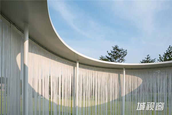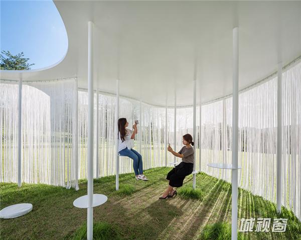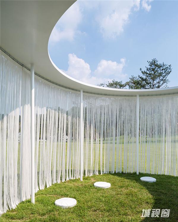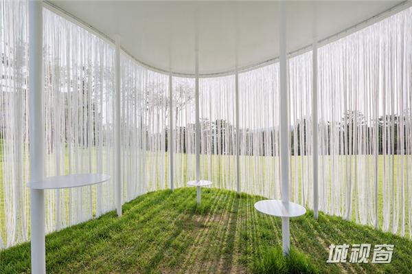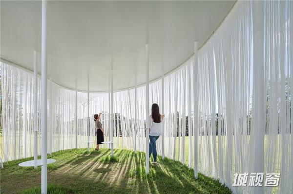 流苏式挂帘悬挂在亭子的周界,在微风中轻轻飘动