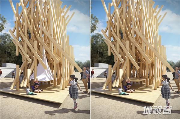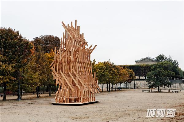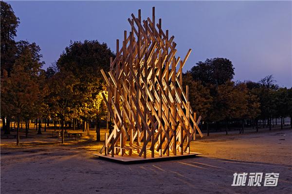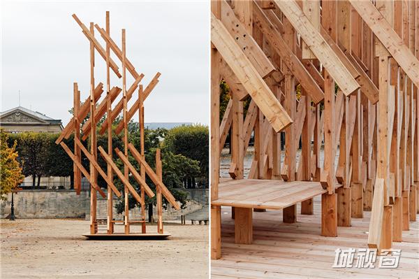 隈研吾先生这么说道,“Yure是一种游牧风格建筑的日式表达法。它起伏像树一般,慢慢地、轻轻地摇摆着他们的树枝和树叶。它整体由相同的木头块堆叠、扭曲和组装,创建出了一个诗意的动态画面。Yure呈现了一种有机几何元素的几何构图。”
