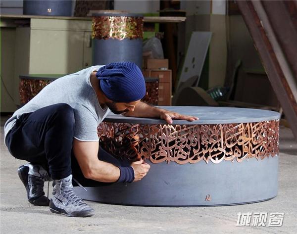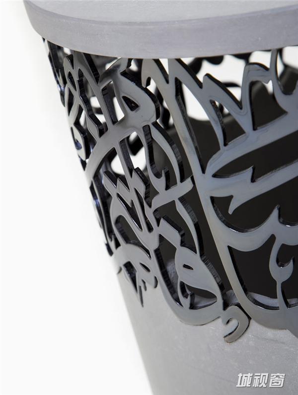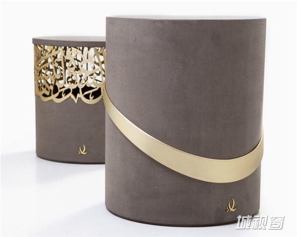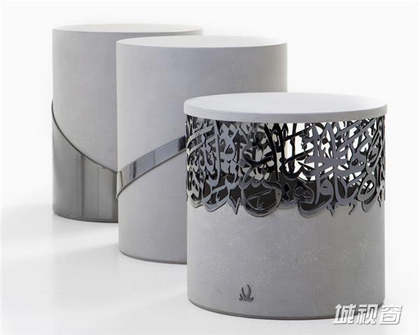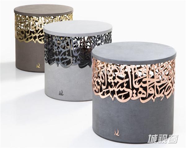 这是黎巴嫩设计师Iyad Naja带来的坐凳系列,正在迪拜设计周上展出。他用金属材质将阿拉伯字体做成镂空的图案,嵌在混凝土的坐凳中,有一种丰富的层次感,也是传统与现代的结合。阿拉伯文字的图案组成富有中东气息的装饰,华丽而有艺术感,并凸显出了材质的特征。这组凳子有金色、黑色和玫瑰色三种颜色。