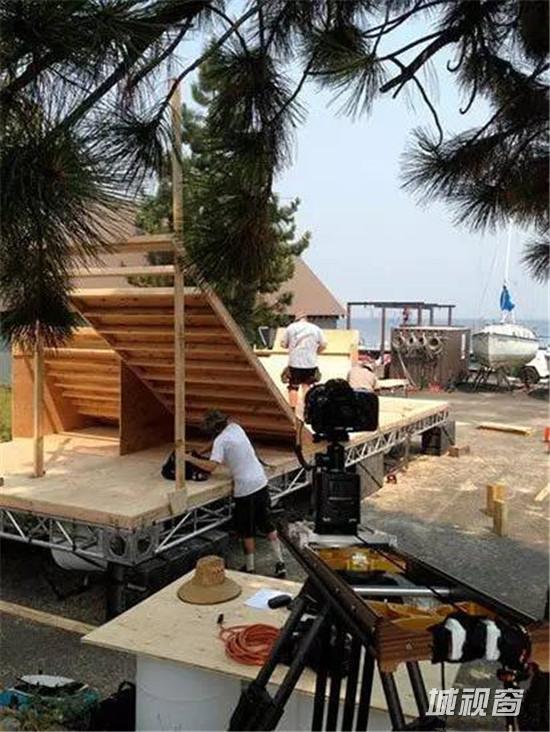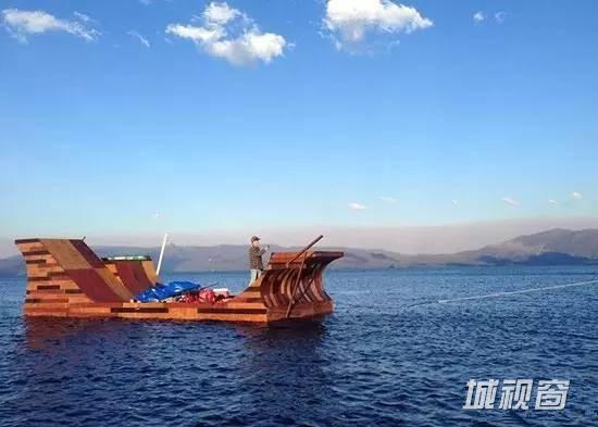 他将坡道固定在漂浮的平台上,并且使用工程技术来确保其不会沉没。坡道做好后被涂上不同的颜色,看上去是一道道的横条纹。建设完成之后,我们可以看到这一7300磅的斜坡被稳稳地固定在幸福州立公园的水面上。