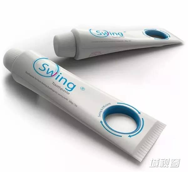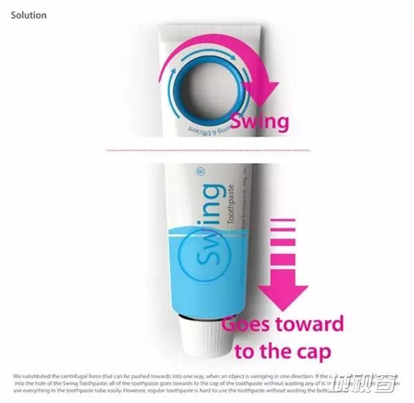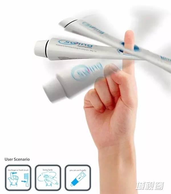 设计师们直接从牙膏包装上着手,在牙膏管末端设置一个旋转圆孔,当你将它挂在手指上旋转时,离心力就会起到挤压作用、推动牙膏往牙膏管口方向移动,让用户在达到目的同时,也享受到乐趣。