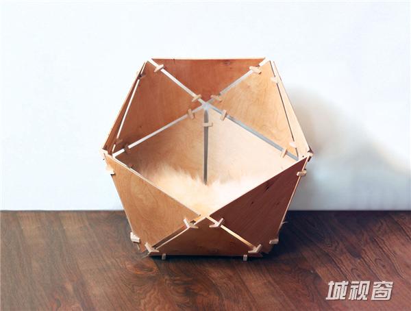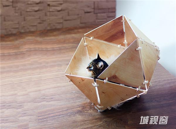 这是一个为猫做的小窝,用三角形的木片拼接而成的一个不完整的多面体,放在角落里非常酷。它能以不同的角度立在地面上,其实也可以自己刷成不同的颜色,充当猫的半个玩具。它还有轻巧方便,容易拼接的特征,且同样适用于体型较小的狗。