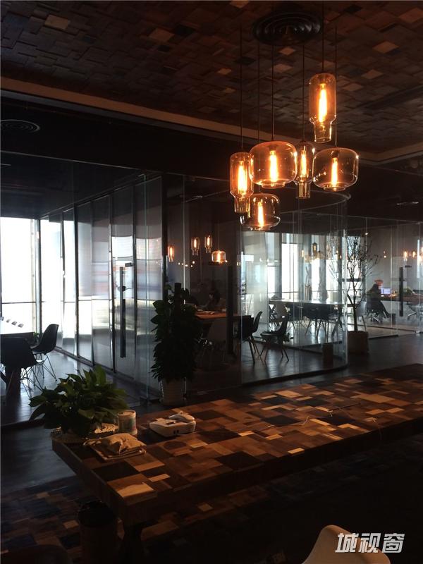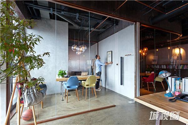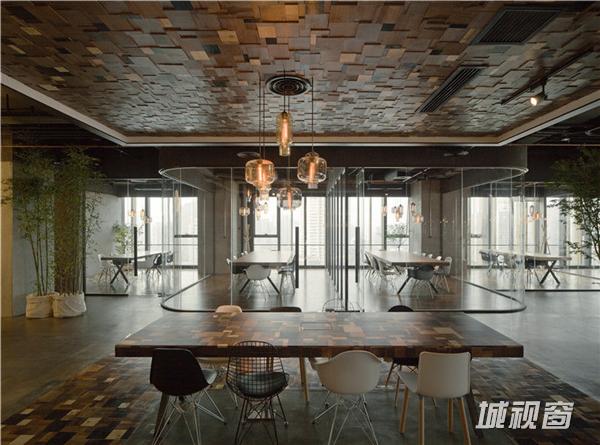 但室内的光线却不因为大面积使用玻璃而通亮,因为使用电脑办公,很多人还会拉上灰色的窗帘。配合悬挂的玻璃灯也有一个深色的半透明灯罩,有些是钨丝灯泡,很有艺术感。设计者想要营造一个夜晚的环境,有辨识度,也因为夜晚是一个容易产生灵感的环境。