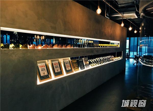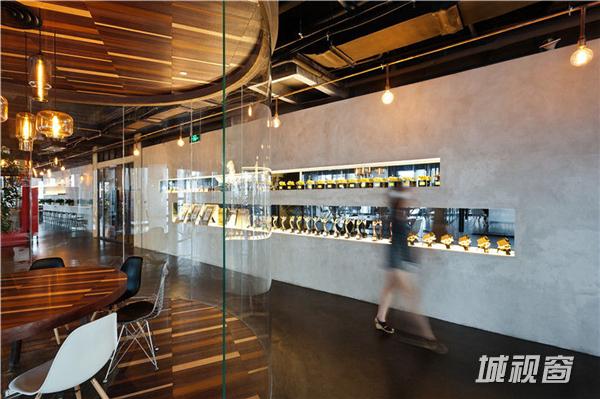 大部分的地面是混凝土地面,玻璃框用了有铁锈的框子,配合着玻璃这些原始的材料,有一种工业感。灯光以及奖杯的光会透过层层玻璃反射,形成琥珀色的光斑,有层层叠叠的感觉。