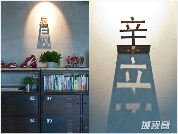 靠着灰色的水泥墙边立着一排柜子,每一个人都有一个带密码锁的抽屉,放一些私人物品。所有柜子看起来都是一样的,设计者用了甲、乙、丙、丁或者子、丑、寅、卯来划分区域,每个文字上配了一盏灯,在墙上投射出文字的影子。 绿色盆景在暗色调里是一个调和,让人觉得舒服。