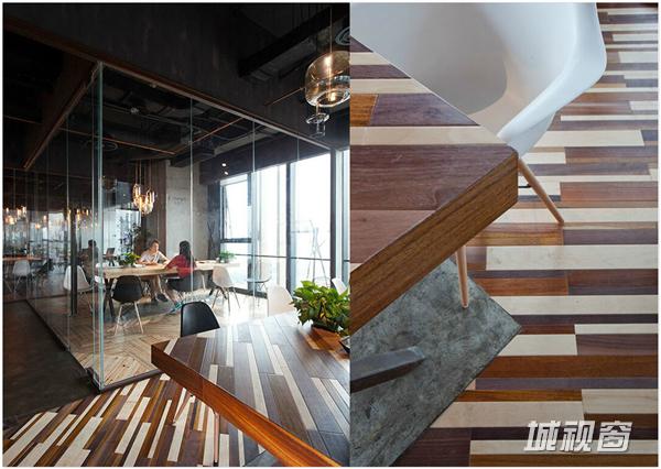 每一个会议室都有不同木面花纹地板,是工匠根据设计师的手稿拼出来的。桌子的花纹与地板是一样的,如果放下去是能完全合起来。设计师希望造成桌子是从地板上浮起来的感觉。一些会议室之间有可折叠的玻璃门,可以打开构成大的会议室。需要注意隐私的时候就将阳光板挂起来,相当于做了一个膜。
