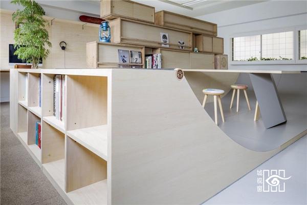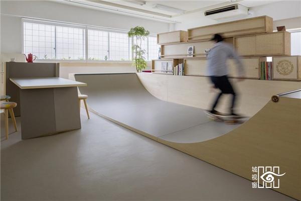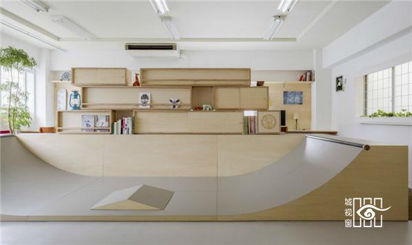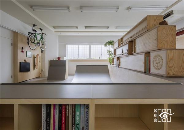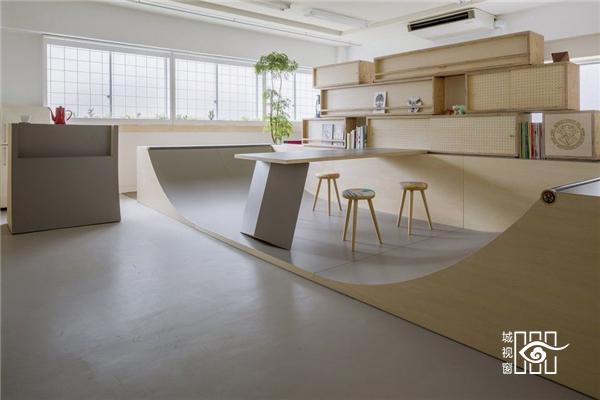 一个热爱滑板的人想要给自己的办公室带来点滑板元素,请来日本东京的SNARK(小阿瀬直)建筑设计事务所设计室内。 “即便是在办公室,也要跟滑板生活离得近。”委托人态度坚定,未曾想对于狭小的办公空间这是一个难题。玩滑板显然需要开阔的场地,需要规划出一个滑道,而不是仅仅挂上滑板了事。此外,还要兼顾办公室的原本职能,不会因为滑板影响到原本的严肃空间。 SNARK 的建筑师重新规划了原先的空地,在中间安放了一个 U 型的滑道,是左右对称的。滑道背后是集装箱一样的书架,大大小小的木箱叠放起来,正反两用,也将办公区域分成两部分——背后是真正的办公区域。