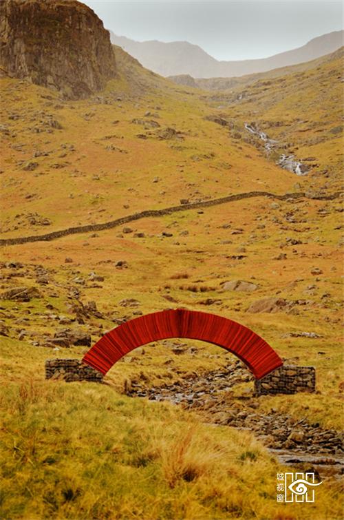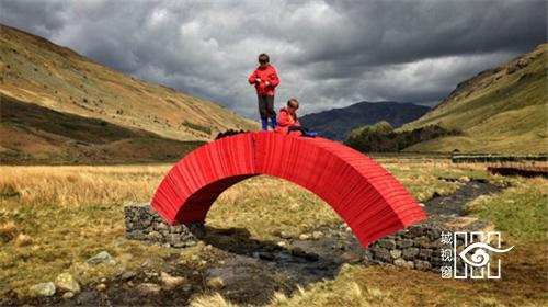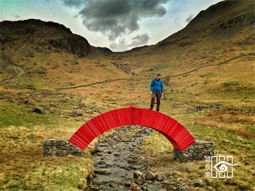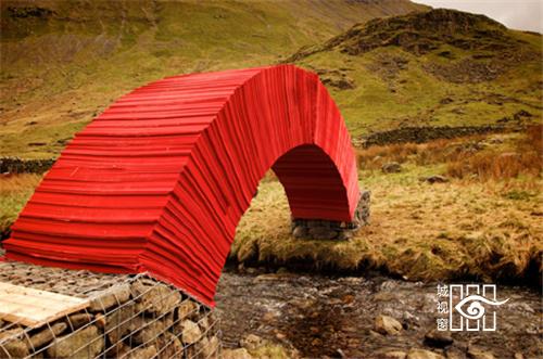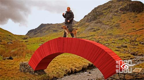 Messam选择用红纸来该桥,是想要突出周围翠绿的环境,他说:“红色能够对比反衬出周围绿色的山丘,让它们看起来更绿。另外我们的眼睛对红色很敏感,离得很远也能看到。我创作的时候会用很多红色的东西,不过只会在合适的时候才用。”