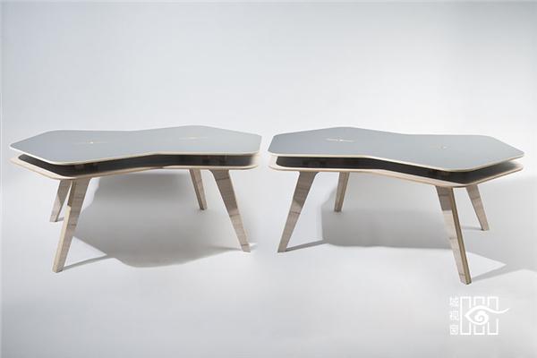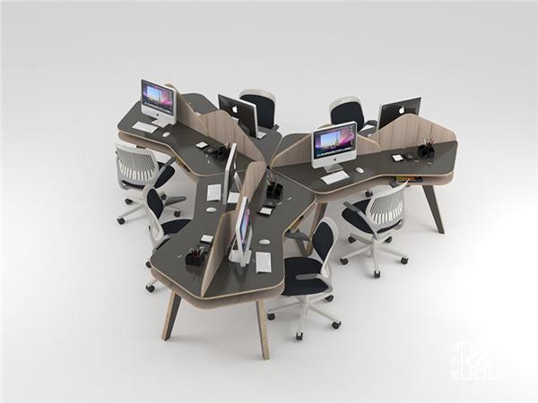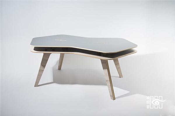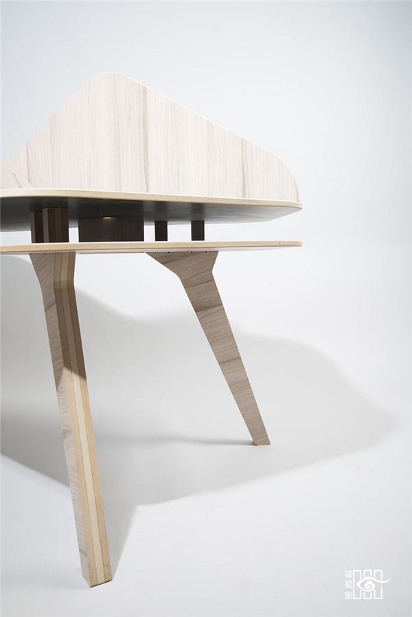 这是一张为开放空间设计的办公桌,所有组件都由15毫米厚的中密度纤维板制成,可以直接拼接而无需螺丝安装。桌子的中间可以镶嵌隔板,成为两边使用的办公桌。桌子的侧边有120度的角,三张桌子可以完整拼接在一起构成社区式的办公空间,很方便,也不会显得拥挤。