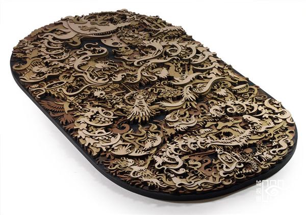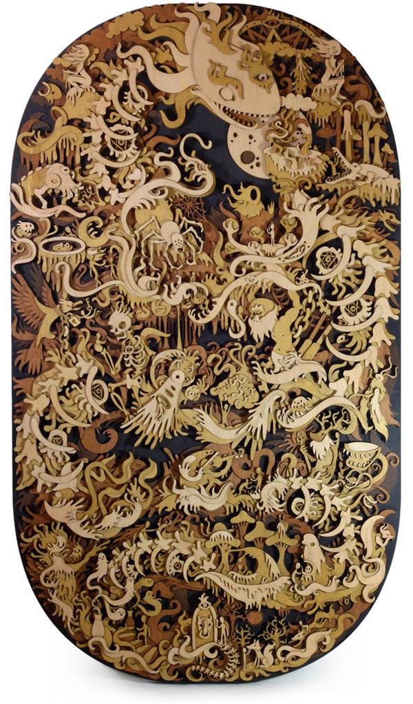 Tomsky曾一度沉迷于在纸上描绘出完美的童话世界,之后他便将这些手稿转化为3D创作,将这些故事用以精致的细节在木材上进行勾勒,茂密的森林,神秘的野兽,恐怖的骷髅,都不在话下。