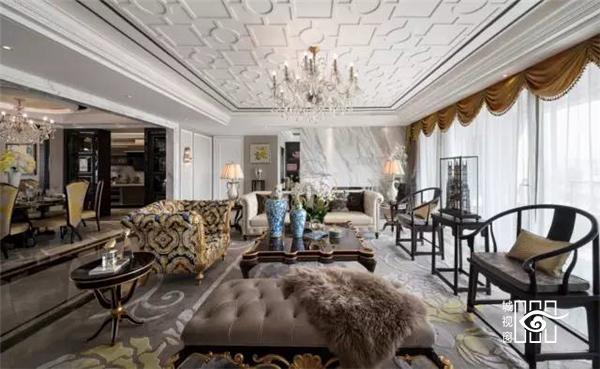『传统的中式魅力散落在居所各个角落,绢帛屏风上手工图案绣绘出“莺歌燕舞”的喜庆氛围,一派欣欣向荣之象。明式韵味圈椅古朴典雅,也寓意着“天圆地方”的宇宙观。进口羊毛地毯上的花纹勾勒出牡丹清雅、端丽的风姿,透露出书香世家的芳馨气质。质朴的靛蓝色点缀着将军瓷瓶,幽幽古韵,清雅脱俗。欧式黑漆家具描上金箔,立体感凸显。大体量欧式风格沙发、茶几烘托出雍容奢华高雅气氛,在设计与生活中演绎华贵,缔造贵族风范。』
