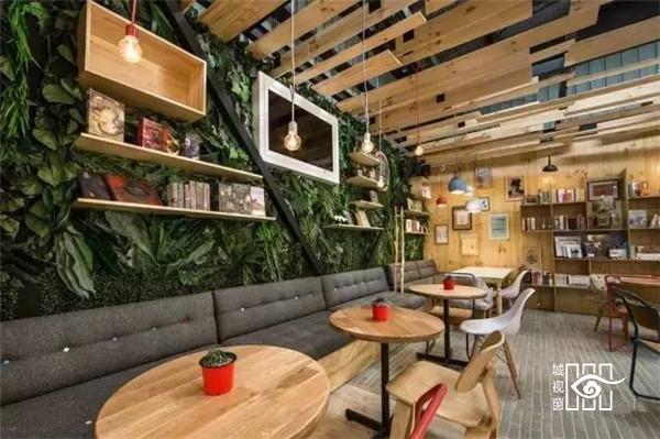 以实木打造天花板、桌椅、墙壁等搭配绿色植物让整个环境看起来充满活力。