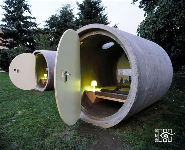 在这些非常规的圆柱形房间里没有任何装饰。由再利用的混凝土管道制成,它们简约充满了工业风。