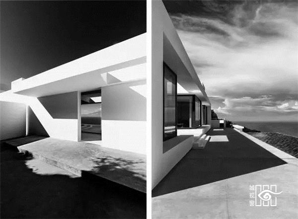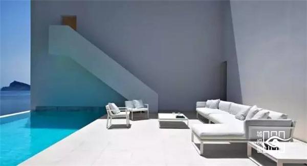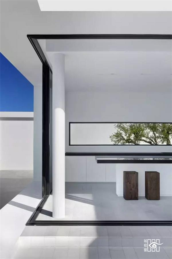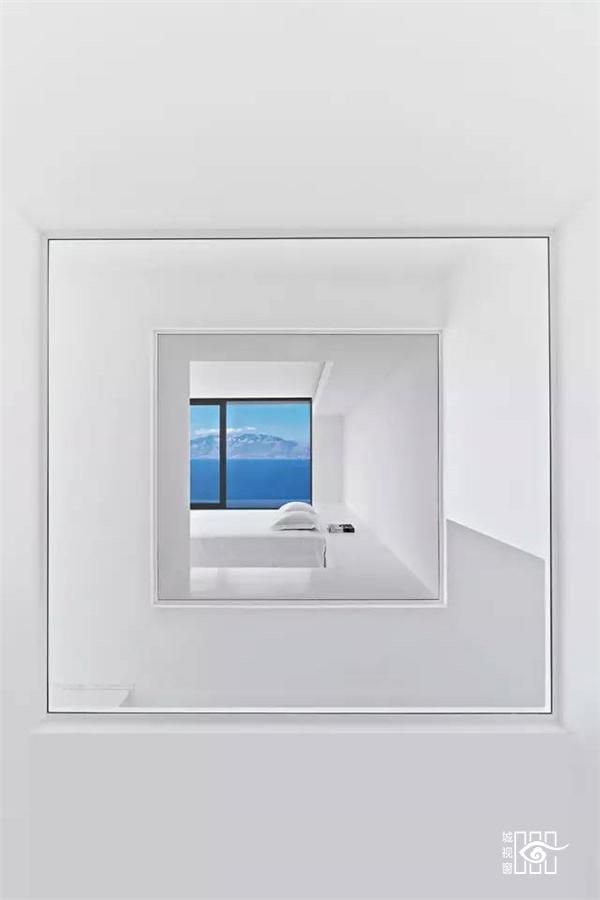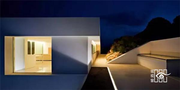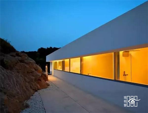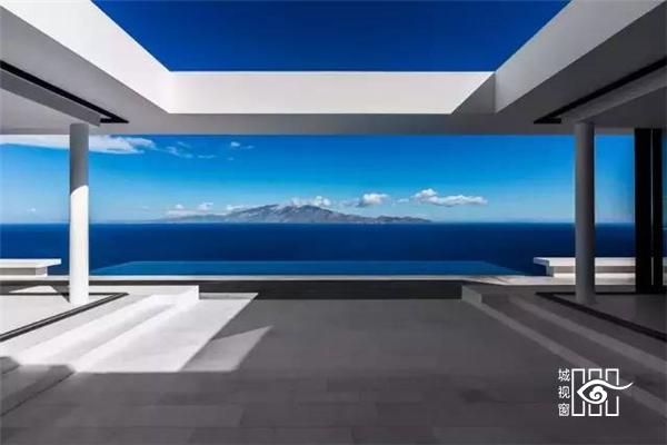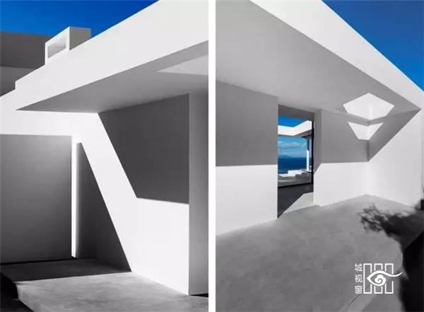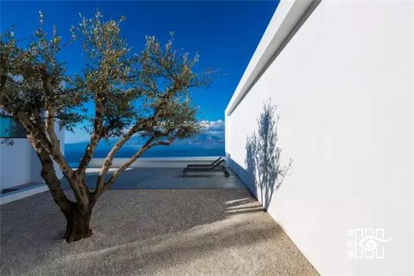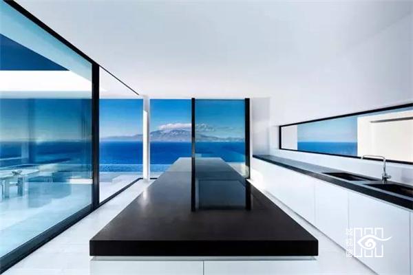 建筑师让房屋靠山而立,模糊内外边界,设立巨大的推拉门,打造出有顶部的露台,尽量享受海天的蓝色与浩淼。建筑的白色源于希腊海岛上传统的建筑。