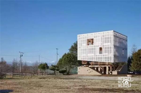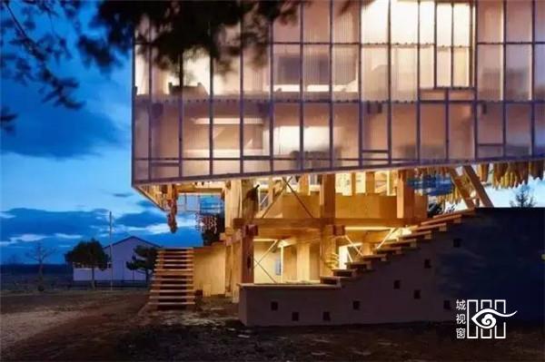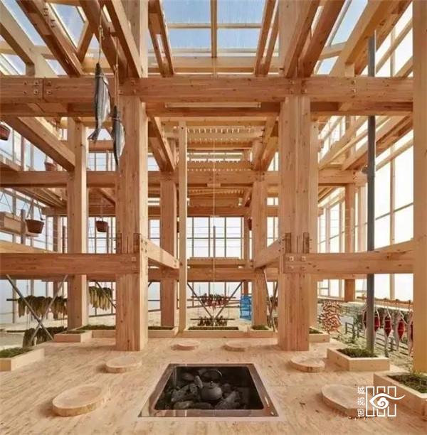 在这犹如鸟巢般的木构架中,受到日本美学与生活意识影响,建筑师设计了一个附有火炉的茶室空间,提供社区居民聚集聊天,并使人在视觉与触觉方面能感受到被食物环绕的状态。从远方望向建筑,会看到植物与食物构成了建筑立面,犹如一座食物森林矗立在这广阔的北海道平原上。