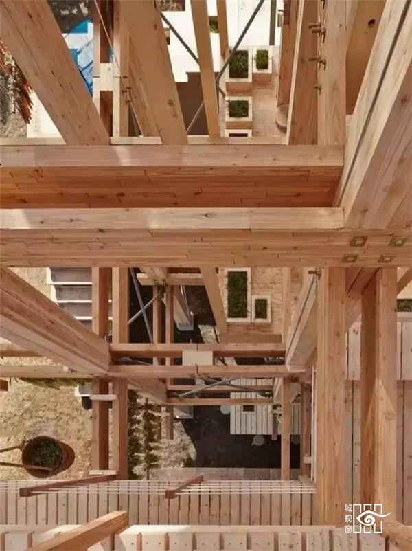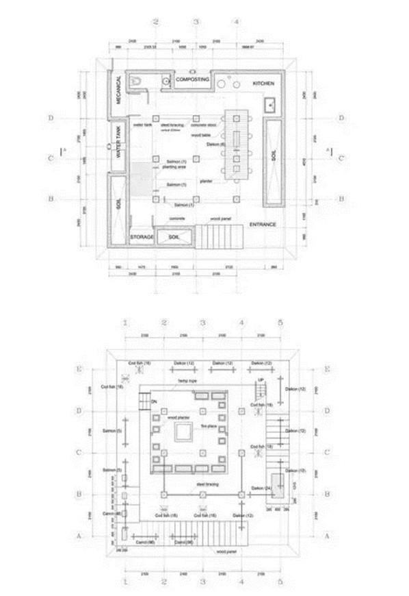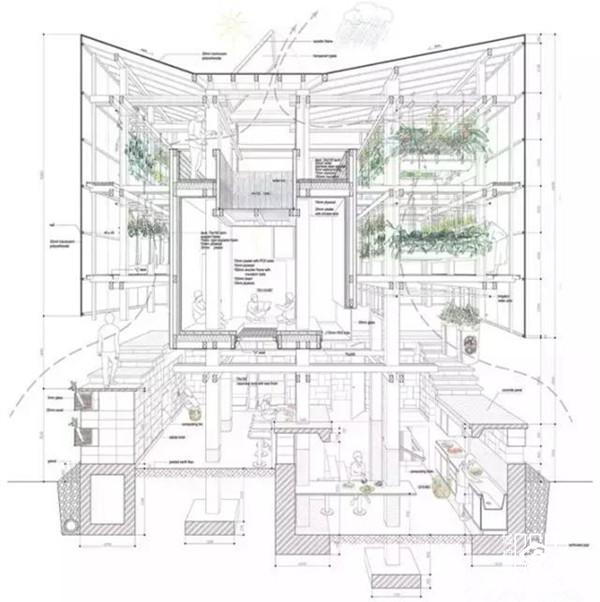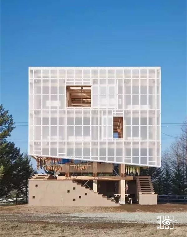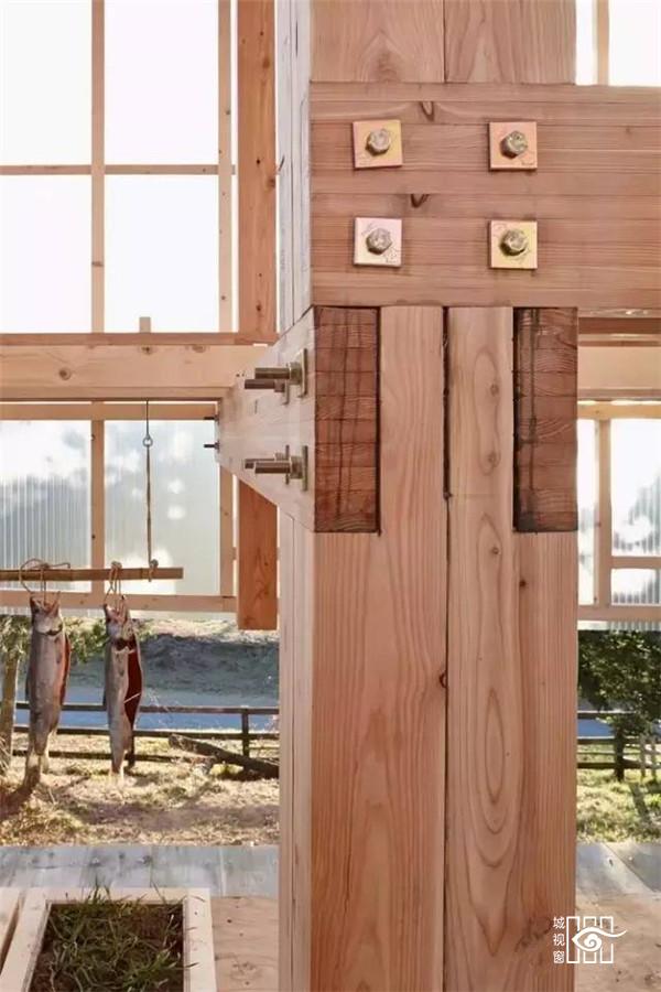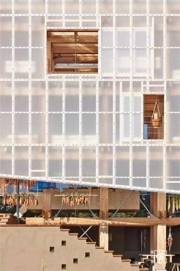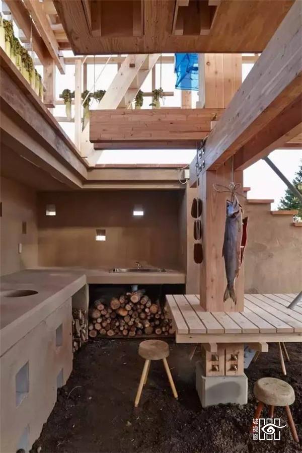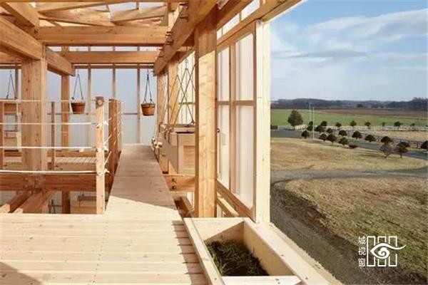 位于地面层的填土墙,除了创造出有趣的微地形与增加种植区域外,亦帮助阻挡西北向的冬季盛行风,社区厨房墙面与堆肥厕所亦整合在厚墙中,使地面层空间使用上更灵活开放,地面厚墙之间设有农作物回收的堆肥空间,提供一个长时间的蓄热与发热来源。项目利用了透明与半透明的塑料浪板引入光线照射植物,加热室内空间,在寒冷的北国冬季延长植物可生长时间;在温暖的夏季,立面的拉门与屋顶的天窗可适度地打开以产生空气对流。使位于空中的茶室享受冬暖夏凉的气候状态。结合日本传统的农作物风干保存法,木构架在内空间之外,更提供食物依据季节风干展示的舞台。在这可吊挂植物与食物的木构架结构,建筑师试图创造日本落叶松木林内的垂直空间经验。