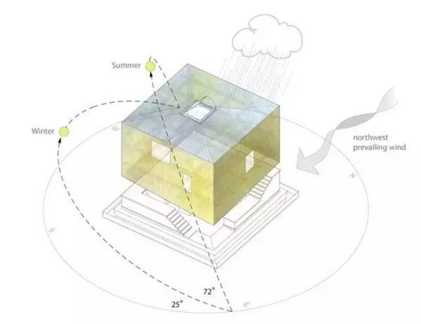 立面的开口可依周遭的自然环境气候与室内环境需求作弹性地调节使用,开口部关闭时可产生室内与户外不同的物理环境状态,开启时可营造北国辽阔的视觉框景与体感的舒适气流。漏斗形屋顶可收集雨水与雪水到地面层的水箱,简单却有效率的集水系统可用来灌溉种植的食物。漏斗的形式象征着将自然的元素〈水、光、空气等〉导入内部的状态。