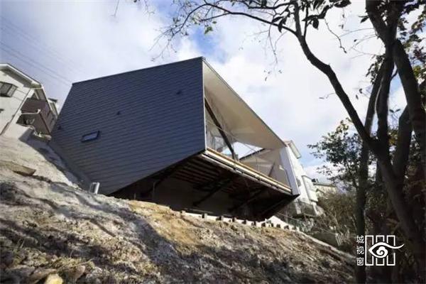 这个K形房屋好像镶嵌在悬崖的斜坡上,在喧闹的城市中只占据着一丢丢有限的空间。房子的门朝后开,站在窗前,整个山下的城市尽收眼底。