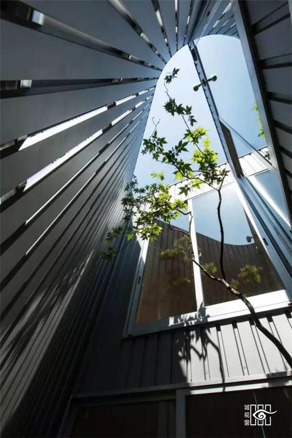 同样,这个房子也没有朝街的窗户,窗户都是掩藏在院内的。望向窗外,环绕整个院子的S形小花园给这个都市空间增加了一丝丝绿意。