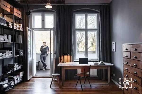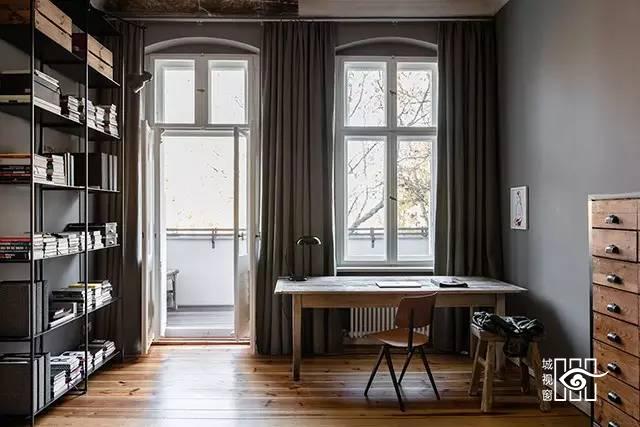 工业感十足的书架和斗柜,配上厚重质朴的原木书桌,灰色墙面和窗帘,书房显得硬朗而又利落。