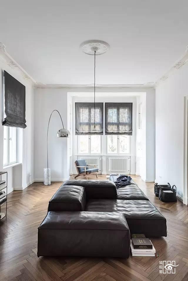人字形实木地板与古朴的空间相得益彰,宽大厚重的真皮沙发错落摆放,休闲的氛围让整个客厅变得活跃。