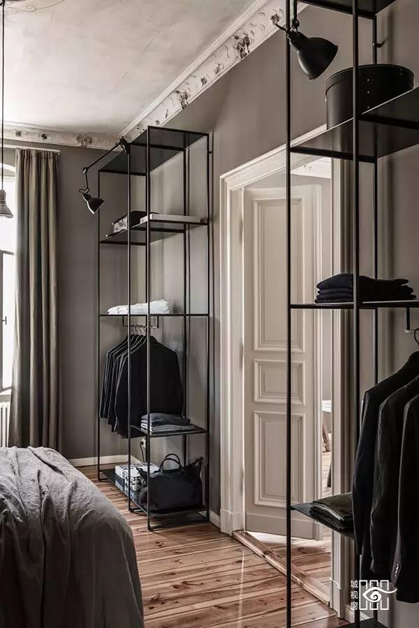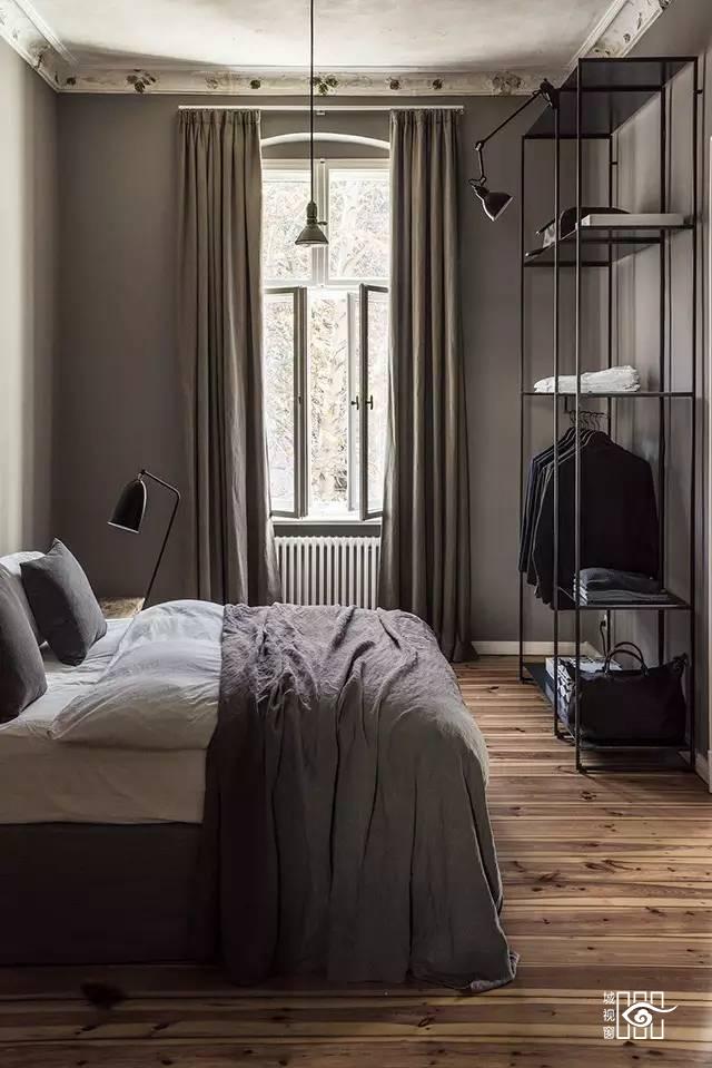 色彩低调的棉麻面料在卧室里的大量应用,明显的对硬朗的工业风起到柔和的作用,即使是卧室里同样摆有金属置物架,也不会觉得冰冷。