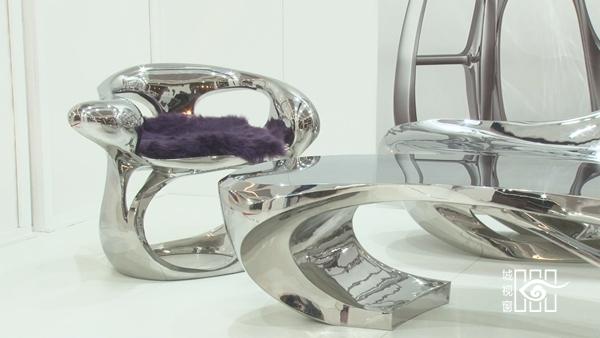 曾少豪:不锈钢的材质本身是冰冷的一种颜色体验,我们设计师利用了紫色、粉色和橙色这种比较有活力的暖色系和不锈钢的刚性结合起来做柔化处理。在展位上的是三位设计师的产品,其中一位是迪谱创始人罗雪春先生,以及罗纤和施华两位优秀设计师的作品。