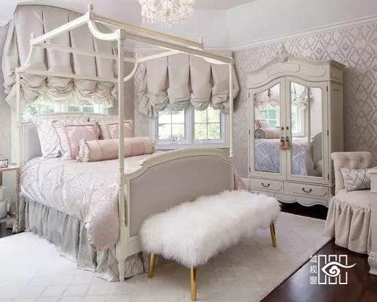 粉色是营造温馨与甜蜜的不二之选,卧室里粉色的配置彰显了小公主般甜蜜少女心。褶皱的窗帘和蜿蜒线条的橱柜都是典型的精致的欧式装饰细节。